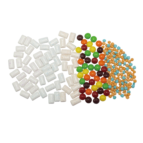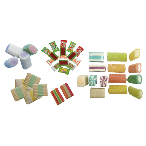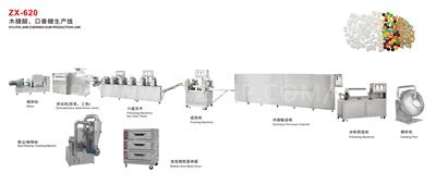 整套生產(chǎn)線由攪拌機(jī)、擠出機(jī)、振動(dòng)輸送帶、異形糖成形機(jī)(六臺(tái))、糖衣機(jī)(六臺(tái))組成。