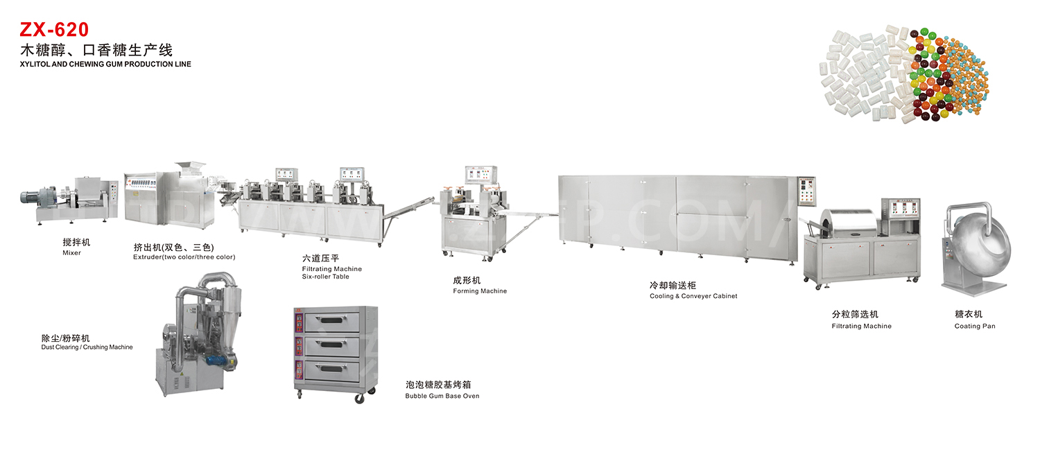 本全自動生產(chǎn)線集攪拌、擠出、六道壓平、成形、冷卻輸送、分粒、上光上色為一體。整套生產(chǎn)線生產(chǎn)性能可靠,操作靈活簡便,自動化程度高,是目前生產(chǎn)木糖醇、口香糖的******選擇。